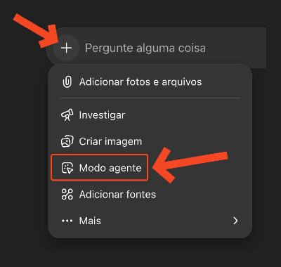Antes de enviar, selecione Modo de Agente (Agent Mode), exemplo para ChatGPT (2025):